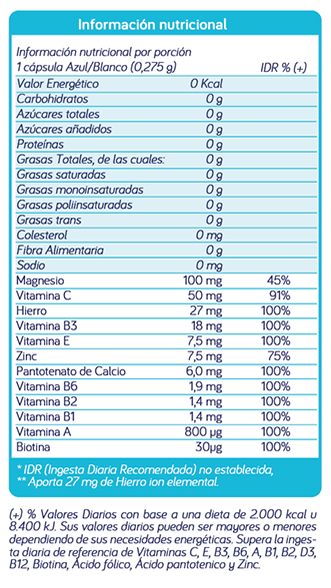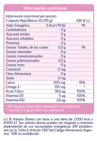 El objetivo de ingerir las cápsulas en forma separada es prevenir la inhibición del Calcio sobre la absorción de Hierro, y la interacción del Ácido fólico con el Hierro.